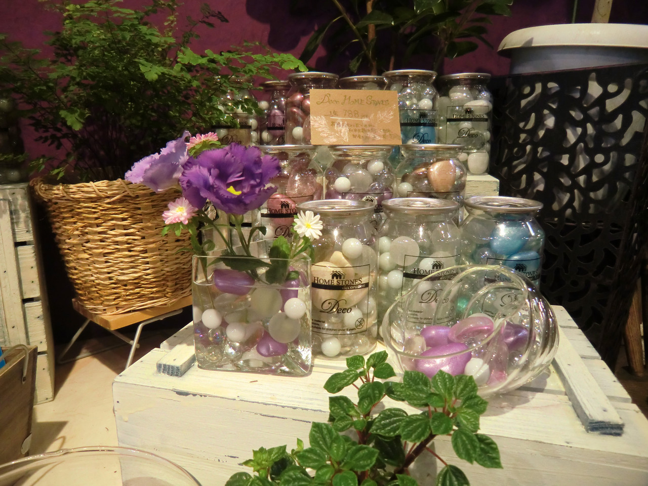 ガラスの花器にビー玉やストーンを入れ、お水を差すと夏らしく涼しげになります♪