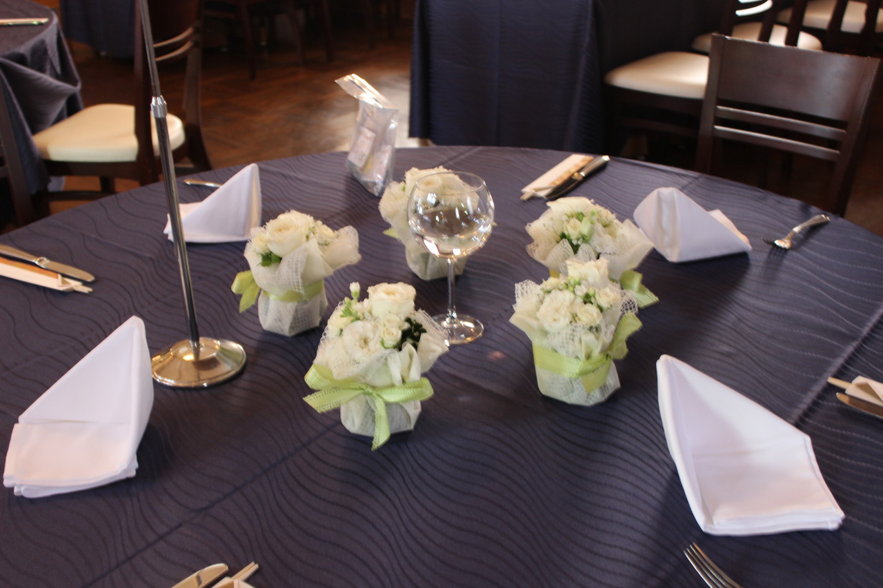 ブーケ風のアレンジメントを飾るゲストテーブルに