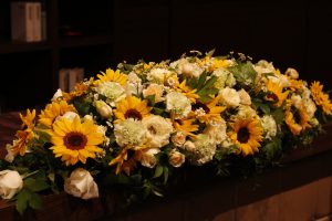 新婦様がヒマワリが大好きなのでヒマワリをメインに季節感あるお花を使ってお作りしました。